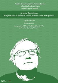 Polskie Stowarzyszenie Racjonalistów i telewizja Racjonalista.tv zapraszają na wykład Andrzeja Dominiczaka "Racjonalność w polityce: rozum, władza i inne namiętności", który odbędzie się 6 grudnia o godz. 18:00 w Audytorium II EF na Wydziale Chemii UWr, ul. F. Joliot-Curie 14, Wrocław.