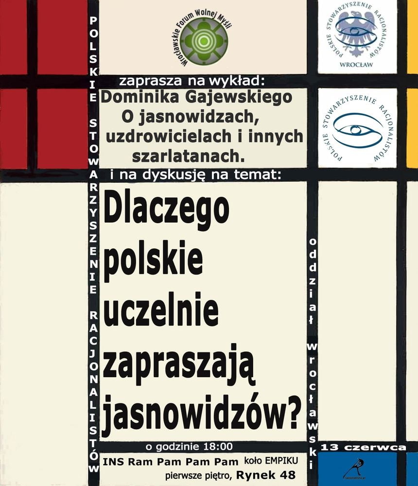Zapraszamy na wykład pt. „O jasnowidzach, uzdrowicielach i innych szarlatanach” i dyskusję, które odbędą się w najbliższy czwartek, 13 czerwca 2013 r. o godz. 18:00, w INS Ram Pam Pam Pam (Wrocław, Rynek 48, I piętro, obok Empiku).